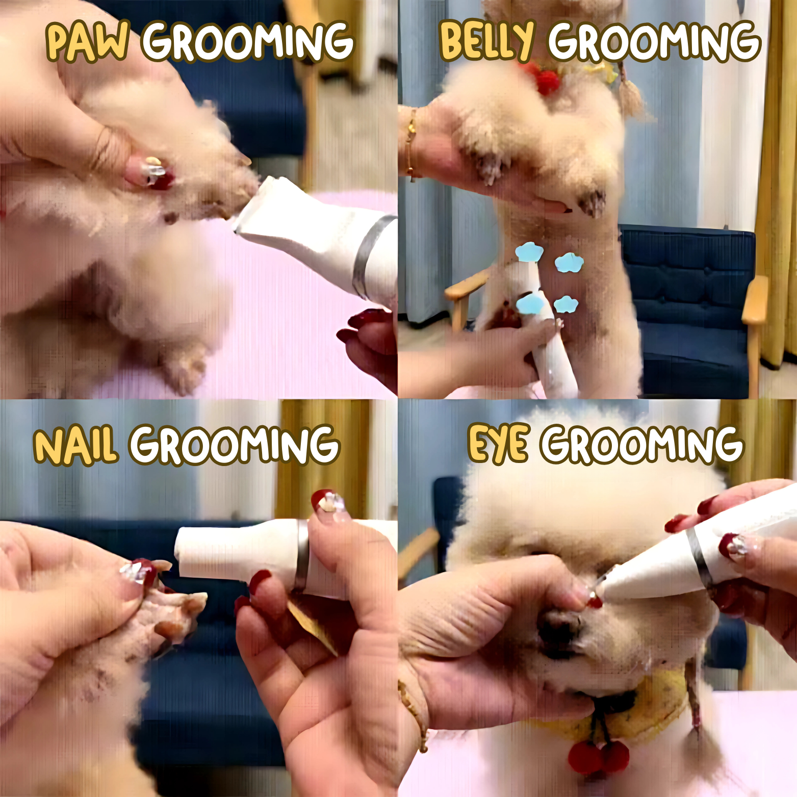Accesorios especializados para las patas, la cara y el pelo para un cepillado perfecto en todo momento.