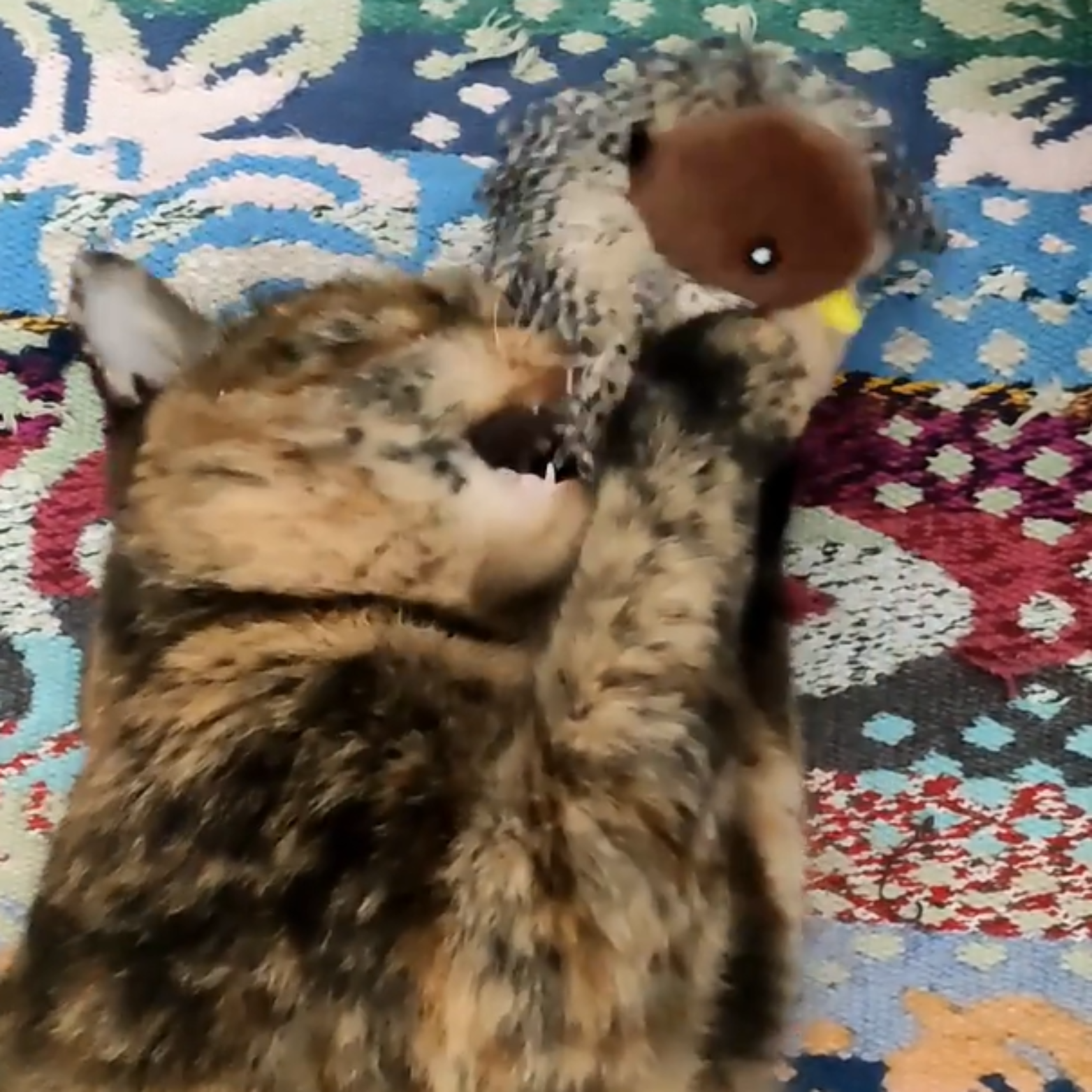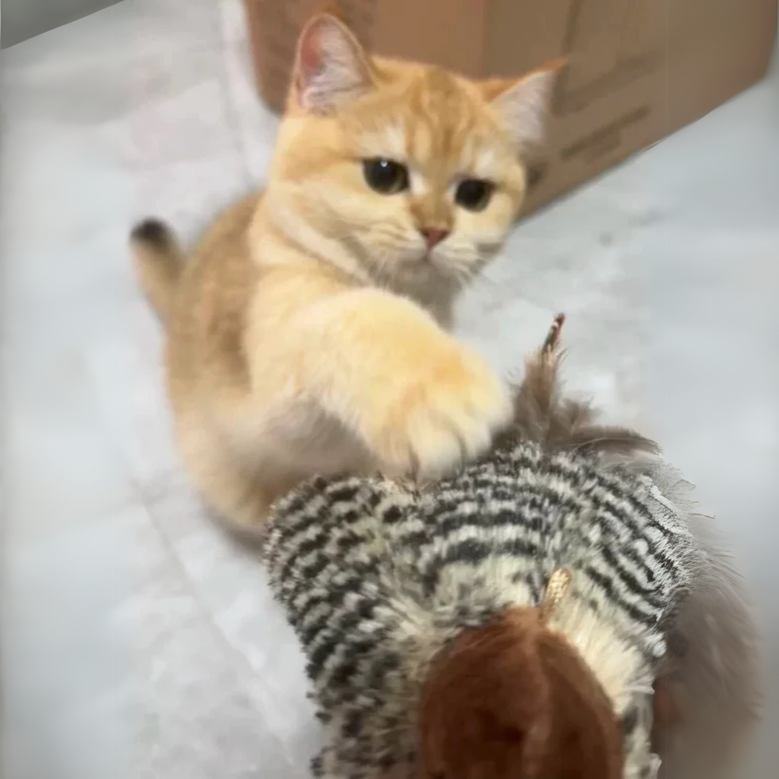 Al principio, mi gata sólo lo inspeccionaba, pero ahora le encanta. Los chirridos realistas y las plumas hacen que se abalance y bata sin parar.