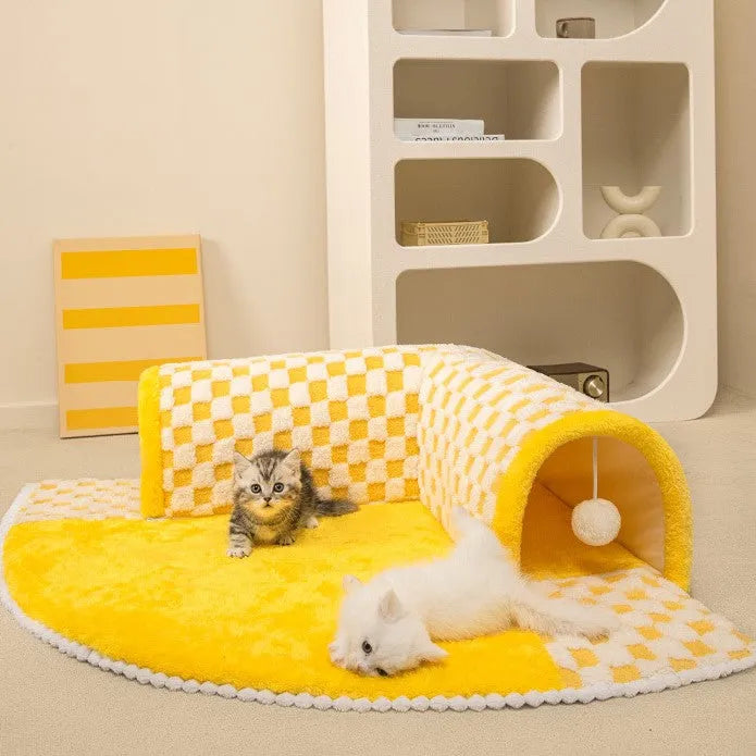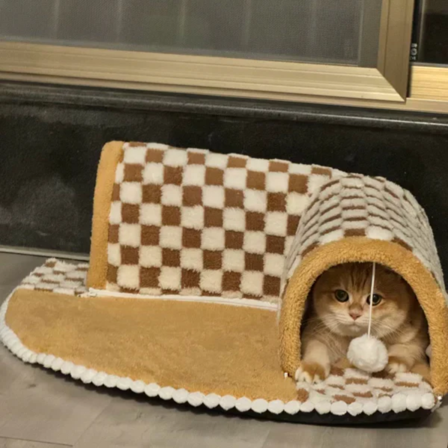 Esta cama ofrece tanto una lujosa zona para dormir como un túnel para jugar, lo que mantiene a tu gato entretenido y cómodo en un solo lugar.