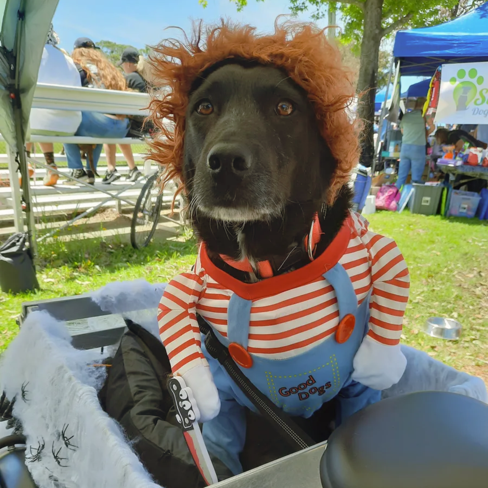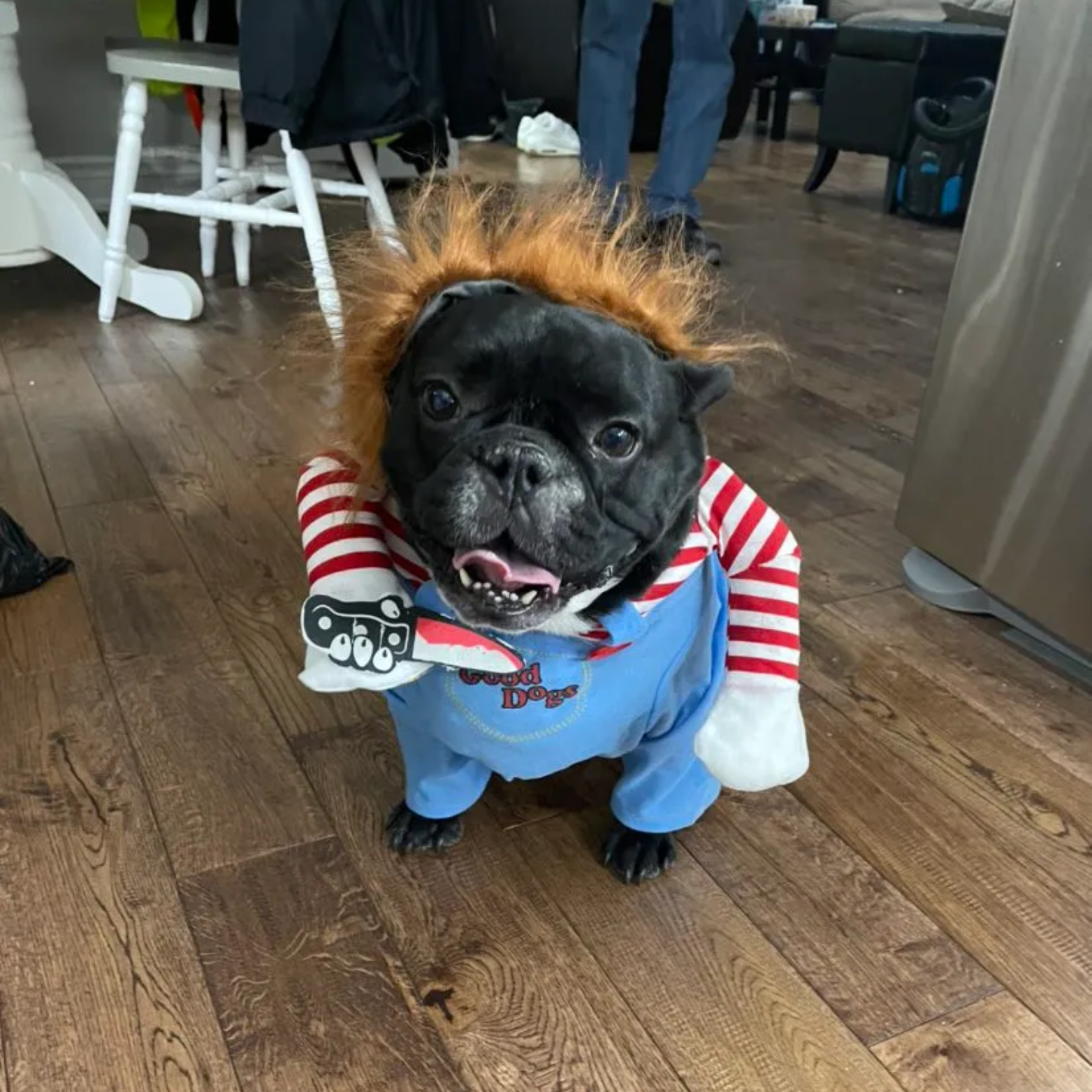 Transform your dog into an iconic horror movie figure resembling Chucky from the 1988 thriller.